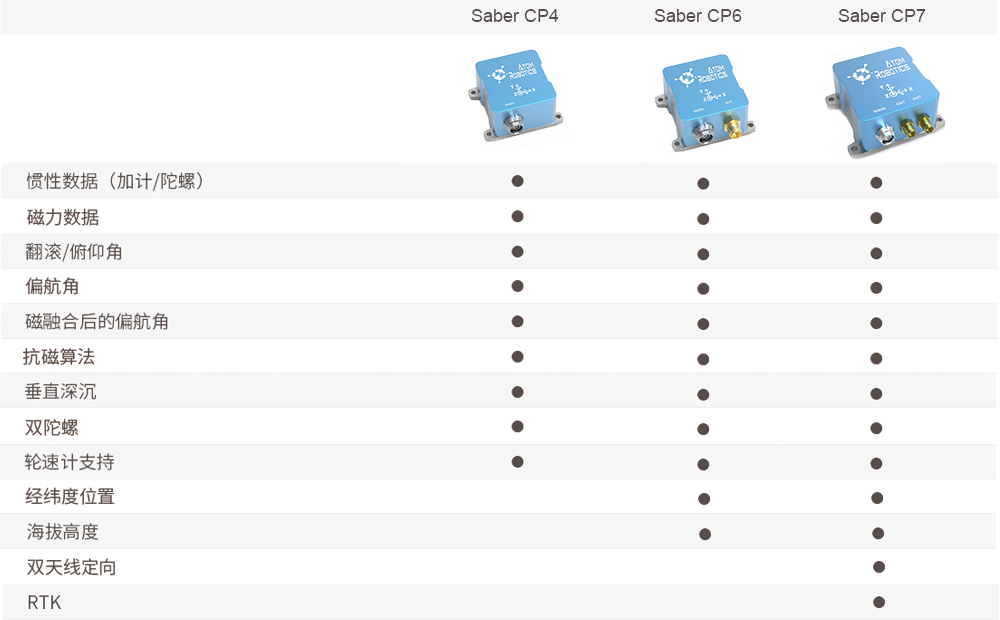 原子机器人基于先进的MENS工艺打造的Saber CP系列(CP4/CP6/CP7)惯性导航/组合导航 模组是针对工业级客户的应用场景而研发出的产品,它是一款兼顾了小型化、高速率和高精度的特点的具有工业IP67等级防水的高可靠性惯性导航传感器, 它同时具备了IMU, VRU, AHRS,GNSS等的功能。